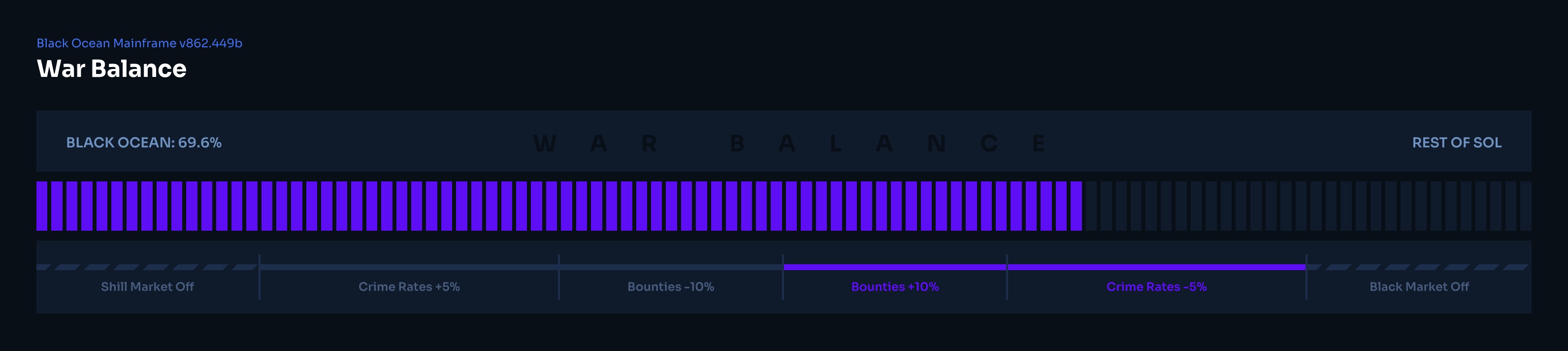In the above example, the war balance is currently 69.6% in favour of Black Ocean (the company you work for in Department 77). Because of this, bounties pay out 10% more than the baseline, and crime rates are down 5%. Life is good!